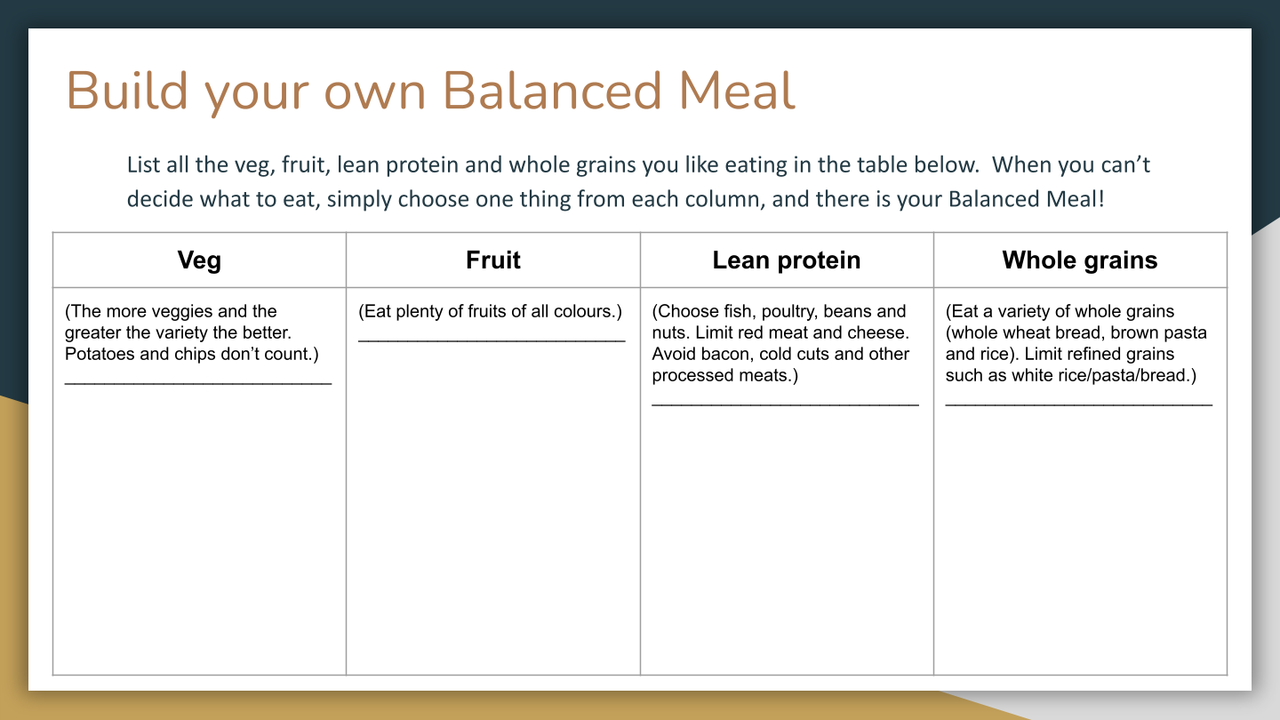 - Create your Balanced Meal cheat sheet to help you plan your meals.