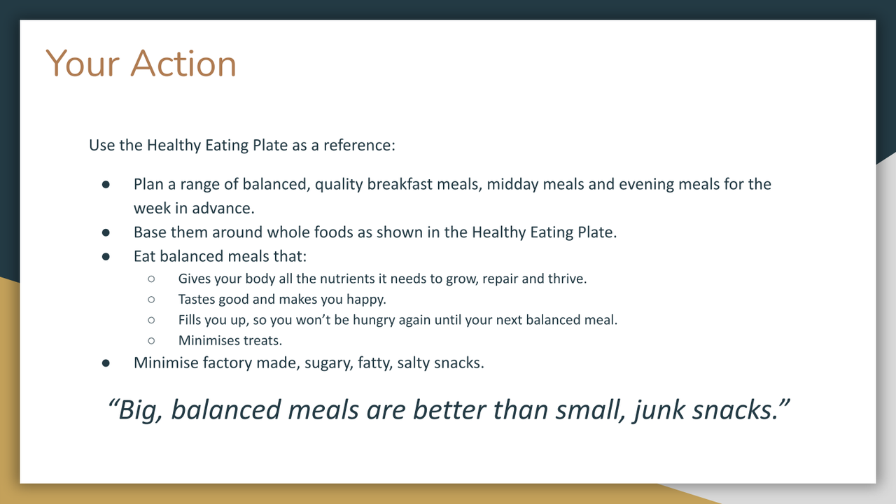 Remember, this isn’t about being perfect. Ask yourself, ‘how can I make this meal a little bit more balanced next time?’