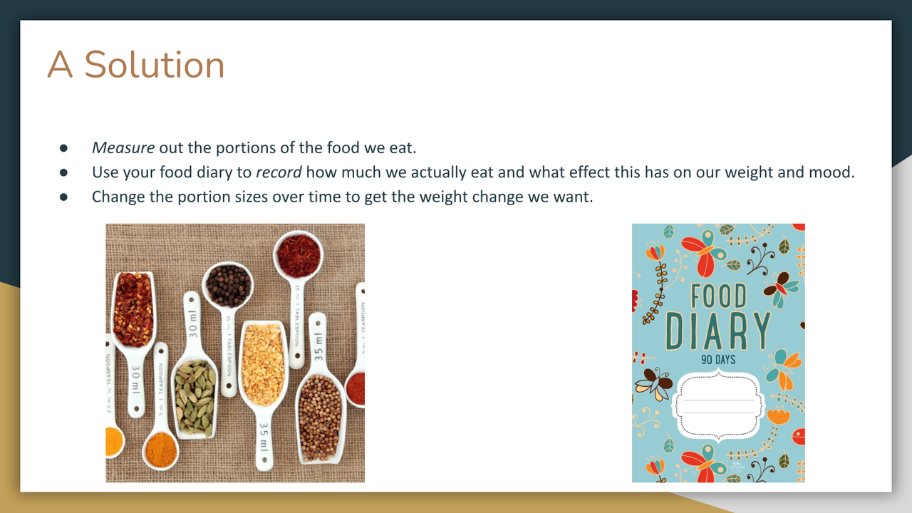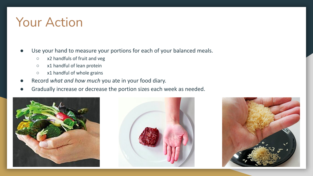 - How you can consistently measure your food portions, so you can adapt these accordingly to meet your health goals?