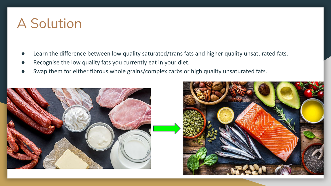 - List your regular food choices that include lower quality fats.