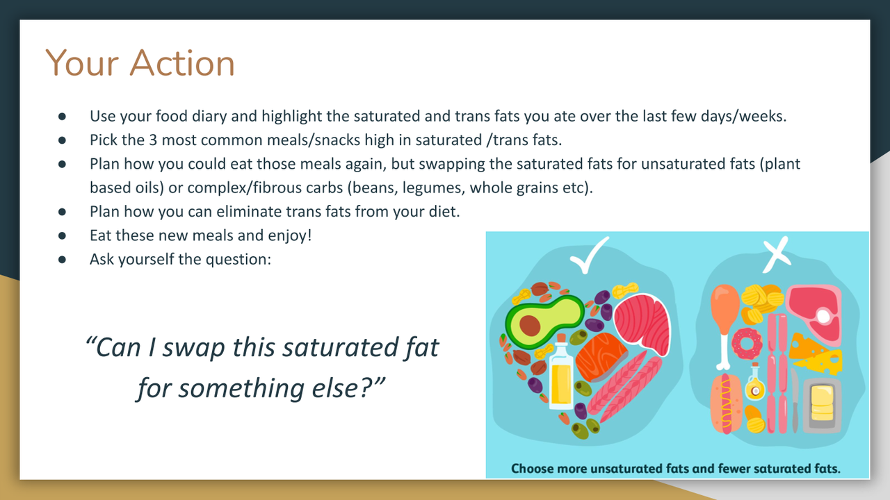 - List the saturated fats you will substitute for unsaturated fats or complex carbohydrates, so you make better, healthier choices.
