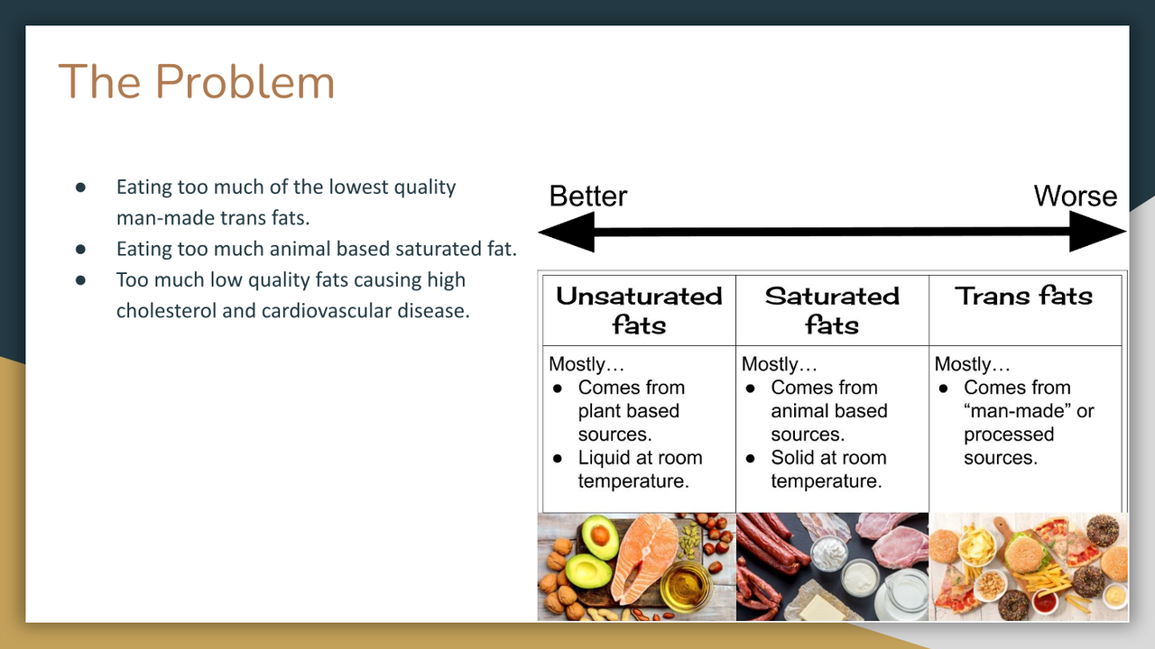 The first thing to remember is that fat is not our enemy. We need fat in our diet. However, too much poor quality fat, saturated and trans fat are not beneficial to your long term health.