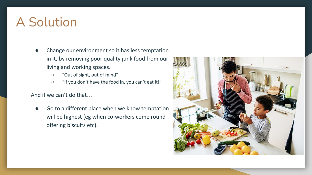 - Ask yourself, why you have the treats in the cupboard in the first place and is there an alternative? Can you swap the processed treats for more wholesome ones, eg swap biscuits and cake for fruit or nuts? Always offering lower quality, processed treats is often out of habit and, we think, perpetuates the habit of eating these treats for others, especially children. We typically eat the way we do because of habits ingrained from childhood.