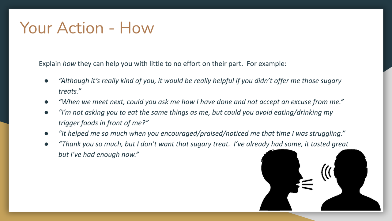 Here is the detailed Action Plan you can follow, like a recipe, to solve the problem. This Action Plan is made up of four linking parts. Each part is important and worth spending some time reviewing how you will use it to help you build a suppport crew that will support you to achieve your health goals.