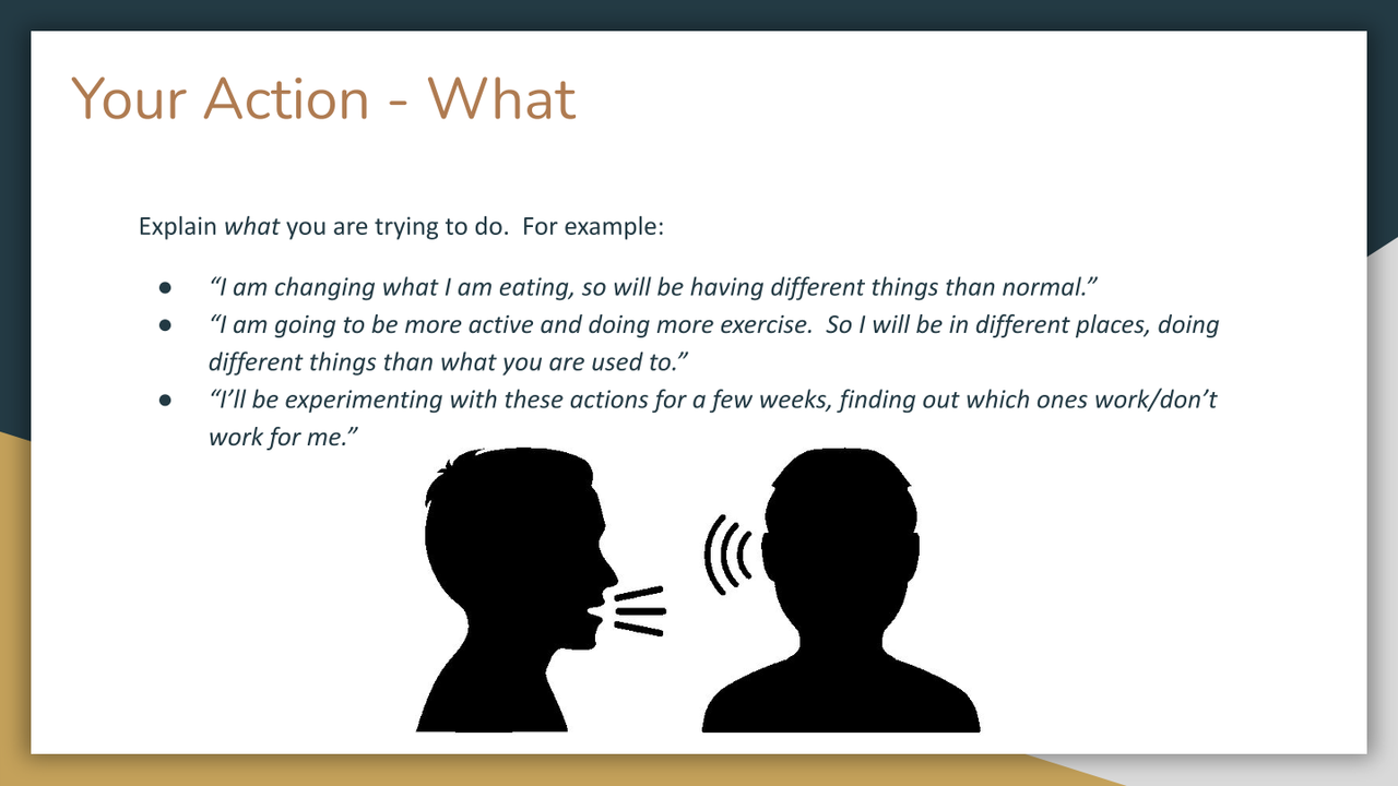 - Re-write Your Action above, but customising it to your personal situation.