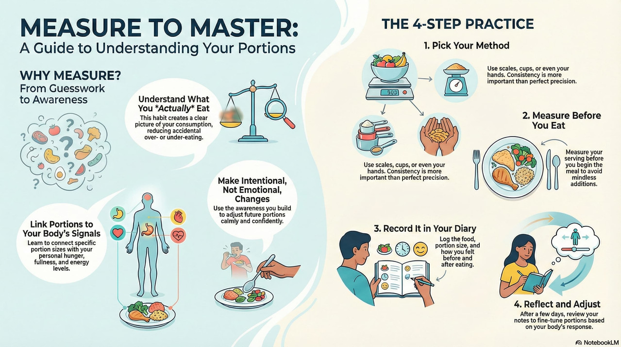 By measuring portions and recording them in your food diary, you build awareness. That awareness then gives you the option to adjust portion sizes in the future, either increasing or decreasing them based on how your body responds.