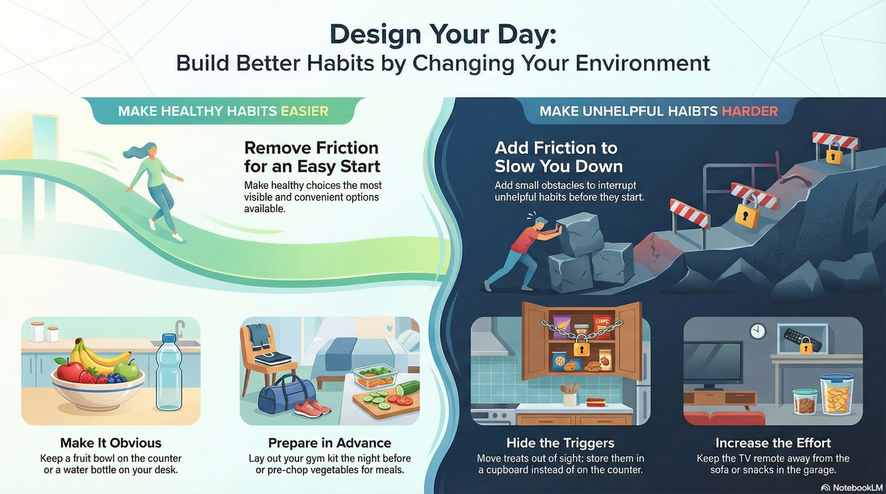 By changing what is around you in your living room, kitchen, workspace or daily routines, you make good choices easier and less helpful choices harder. The goal is not self-control. The goal is better setup.